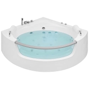 Eckbadewanne mit Whirlpool-Funktion, aus weißem Sanitäracryl 2 weiße Nackenstütze, LED Unterwasserbeleuchtung in 7 unterschiedlichen Farben Whirlpooldüsen: 18x kleine Düsen, 2x große Düsen,…
