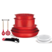 Arthur Martin, AMR41, 10-teiliges Aluminium-Kochgeschirr-Set mit Griffbeschichtung, 20-22-26 cm Bratpfannen, 16-18 cm Kochtöpfe, luftdichter Deckel, 2 Utensilien, Rot