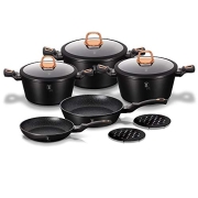 Berlinger BH-6191 Haus Rose Gold Kochtopf Set Induktion 11-Teiliges, Antihaft PFOA-frei Marmor, Aluminium, Set 3 Töpfe, 4 Glasdeckel, 1 Grillpfannen, 1 Bratpfannen, 2 Untersetzer, Design Metallic Line
