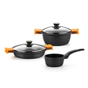 3-teiliges Kochgeschirr-Set aus strapazierfähigem Aluminiumguss mit pfoafreier Antihaftbeschichtung Zusammensetzung: hoher Kochtopf 24 cm mit Deckel -4 Liter (Durchmesser Boden 16,9 cm) / niedriger…