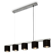 Diese höhenverstellbare Deckenlampe für das Esszimmer besticht durch die markante Retro-Optik mit antik-silberner Farbe. 5 schwarze Stoffschirme mit silberner Innenfolie erzeugen ein gedämpftes Licht…