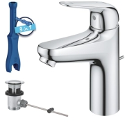 Grohe QUICKFIX Start Badarmatur Einhand-Waschtischbatterie DN 15 M-Size Chrom mit Montagewerkzeug 24204002 Glatter Körper mit Push-open Ablaufgarnitur