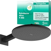 hansgrohe Raindance Alive S - Kopfbrause mit Brausearm, runde Duschbrause (300 mm), Regendusche mit 2 Strahlarten für Wandmontage, Brausekopf mit Antikalk-Funktion, Mattschwarz, 24540670