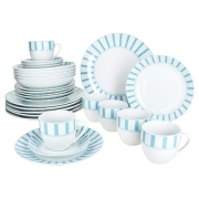 MamboCat Split türkis 30tlg Kombiservice I weißes Porzellan-Geschirrset mit Streifen für 6 Personen I Je 6x Tassen, Untertassen, Kuchenteller, Suppenteller & Speiseteller