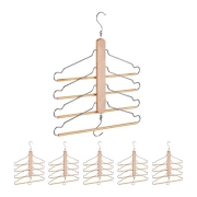 Relaxdays 6 x Mehrfachkleiderbügel, Halter mit 4 beweglichen Bügeln, Schrank-Organizer, mit Metallhaken, Lotusholz, Natur