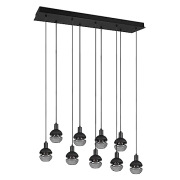 Pendelleuchte Mela 9-flammig in Metall Schwarz matt mit Gläsern schwarz/rauchfarbig Leuchte exklusive Leuchtmittel. Empfohlenes Leuchtmittel 9x E14 max. 40 Watt Die Leuchte hat eine Breite von 102cm…