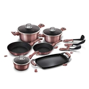 BerlingerHaus Haus I-Rose Kochtopf Set Induktion 12-Teiliges, Antihaft Titan PFOA-frei, Aluminium, 2 Töpfe 1 Stielkasserolle Glasdeckeln 2 Bratpfannen 1 Grillplatte 3 Küchenutensilien, Modernes Design, BH-6044, Rosa
