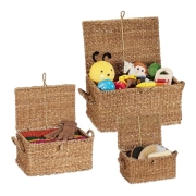 Relaxdays Aufbewahrungskörbe, 3er Set, Wasserhyazinthe, Geflochten, Boxen ineinander stapelbar, Tragbar, Natur/Schwarz
