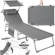 tectake® Sonnenliege mit Dach, Liege klappbar mit Kopfkissen + Seitentasche, zusammenklappbar, leicht tragbar, Strandliege, Liegestuhl klappbar für Garten, Sonnenliege Camping - grau