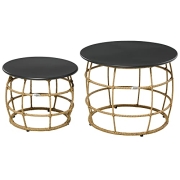 Outsunny Rattan Beistelltisch 2er-Set, Couchtisch mit Glasplatte, Stapelbarer Sofatisch, Boho-Stil, Handgeflochtener Kaffeetisch für Garten, Balkon, Stahl, Khaki