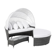 Runde Lounge- und Sonneninsel mit viel Platz zum Entspannen, bestehend aus halbrundem Strandkorb mit Sonnendach, halbrundem Hocker, welcher als Fußteil sowie als zusätzliche Sitzgelegenheit genutzt…