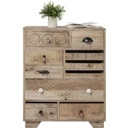 Handgeschnitzte ornamentale Muster an den Fronten machen jedes Stück zu einem authentischen Unikat Eine klare und moderne Formensprache und der leichte Vintage-Flair der charmant gestalteten Kommode…