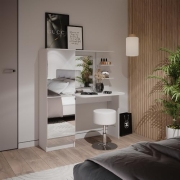 Unser Schminktisch Charlotte bietet durch die Melaminharzbeschichtung eine kratzfeste und pflegeleichte Oberfläche. Dieser Kosmetiktisch mit Spiegel hat vier offene Ablagen und zwei Regale für…