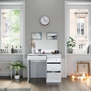 Entdecken Sie unsere elegante Frisierkommode Alexa im zeitlosen Weiß-Eiche - Dekor. Komplett mit Hocker und LED-Lampen – der perfekte Kosmetiktisch für Ihr Styling-Bedürfnis. Unser Schminktisch…