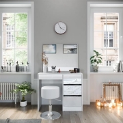 Entdecken Sie unsere elegante Frisierkommode Alexa im zeitlosen Weiß-Eiche - Dekor. Komplett mit Hocker und LED-Lampen – der perfekte Kosmetiktisch für Ihr Styling-Bedürfnis. Unser Schminktisch…