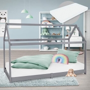 ML-Design Kinderbett 90x200 cm Hellgrau mit Matratze H:16 cm, Dach, Lattenrost, Kinderhaus aus Kiefernholz, Stabiles Jugendbett, Mädchen & Jungen Hausbett, Massivholz Kinder Bett, Bettenhaus Spielbett