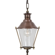 Een zeer rustieke hanglamp voor de veranda, buitenkeuken, balkon of gewoon binnen in een sfeervol interieur. De zeer solide verandalamp is vervaardigd van koper en brons en heeft een kap van echt…