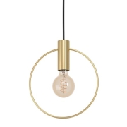 Die Pendelleuchte aus Metall in Messing-Gebürstet mit einem Ring und einer innenliegenden Fassung sowie einem schwarzen Textilkabel fügt sich elegant in den minimalistischen Trend ein Die Hängelampe…