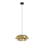 Die hängende Esstischlampe ist mit zwei ineinander gesetzten, runden Metall-Lampenschirmen in Messing-gebürstet und einer goldfarbenen Innenfläche versehen Dank der Öffnung am inneren Schirm entsteht…