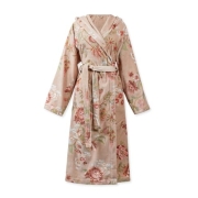 design: mauve bademantel mit große pfingstrosen, fantasievolle blumen, blätter, brombeeren, beerenbüschel und paradiesvögel.…