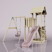 Spielplatz für den Garten: Der Smart Candy mit Podesthöhe 120 cm zeichnet sich durch seinen großen Sandkasten, eine Kinderschaukel, eine Rutsche mit Wasseranschluss sowie einem Spielhaus mit Fenster…