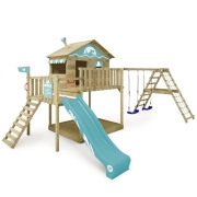 WICKEY Spielturm Klettergerüst Smart Ocean mit Schaukel & pastellblauer Rutsche, Outdoor Kinder Kletterturm mit Sandkasten, Leiter & Spiel-Zubehör für den Garten